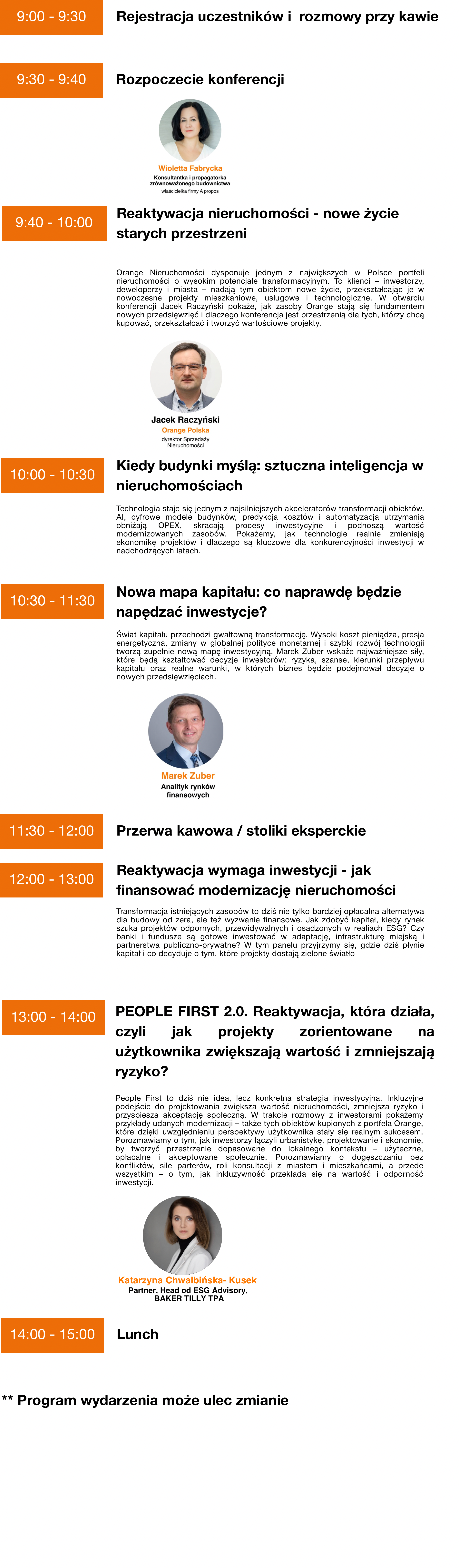 Podczas konferencji zaprezentujemy również konkretne case studies, pokazujące, w jaki sposób inwestorzy przekształcają nieruchomości Orange, nadając im nowe życie właśnie w oparciu o kapitał, technologię i użytkownika . Uczestnicy będą mieli okazję zobaczyć, jak w praktyce wygląda udana modernizacja zasobów: jak łączyć strategię finansową z technologią i potrzebami użytkowników.